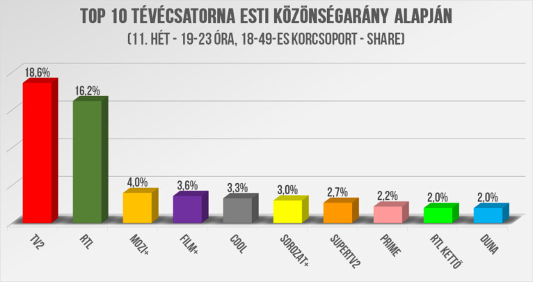 A heti összesítésben ismét a TV2 nyert az RTL előtt, az előző héthez hasonló arányban, 2,4 százalékponttal. A harmadik – egy hét kihagyás után – újra a Mozi+ lett, a Film+ pedig csak a negyedik, míg a Cool az ötödik helyen végzett. 3 százalék felett teljesített még a Sorozat+. A közepes kábelcsatornák közül az utóbb említett mellett a legjobbak közé került még a Prime is, további részletek a grafikonunkban. (Minden esetben lineáris share%-ot és 18-59-es adatokat elemezzük, kivéve, ahol egyéb korosztály van jelölve. A főműsoridő január óta 18-23 óra között értendő.)