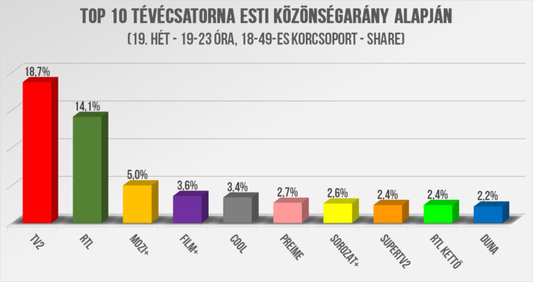 A heti összesítésben mindössze két hét után a TV2 visszavette a vezetést az RTL előtt, méghozzá ezúttal nem kis különbség volt a két nagy csatorna között, 4,6 százalékpont. A harmadik most is a Mozi+ lett, a negyedik a Film+, az ötödik pedig a Cool. A közepes méretű kábelcsatornák közül a Prime és a Sorozat+jutott be a legjobbak közé, további részletek a grafikonunkban. (Minden esetben lineáris share%-ot és 18-59-es adatokat elemezzük, kivéve, ahol egyéb korosztály van jelölve. A főműsoridő január óta 18-23 óra között értendő.)