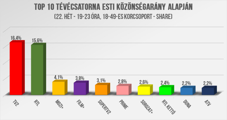 A heti összesítésben ismét a TV2 nyert az RTL előtt, de ezúttal csak 0,8 százalékponttal. A kisebb különbség a BL-döntő tarolásának és A hegyi doktor rossz teljesítményének köszönhető. A harmadik most is a Mozi+ lett, a negyedik a Film+, az ötödik pedig a SuperTV2. A közepes kábelcsatornák közül a Prime, a Sorozat+ és hosszú idő után az ATV került be a legjobbak közé, további részletek a grafikonunkban. (Minden esetben lineáris share%-ot és 18-59-es adatokat elemezzük, kivéve, ahol egyéb korosztály van jelölve. A főműsoridő január óta 18-23 óra között értendő.)