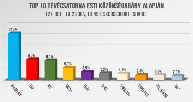 A heti összesítésben az M4 Sport ismét a legnézettebb csatorna volt, most is hatalmas fölénnyel. Ezúttal a második azonban a TV2 lett és az RTL csak a harmadik. A negyedik helyen a Mozi+ végzett, az ötödiken pedig a Film+. 3 százalék felett volt még a Cool és a meglepő módon a Sorozat+. Utóbbin kívül a közepes kábelcsatornák közül a legjobbak közé került még az RTL Három és az AMC. További részletek a grafikonunkban. (Minden esetben lineáris share%-ot és 18-49-es adatokat elemezzük, kivéve, ahol egyéb korosztály van jelölve.)