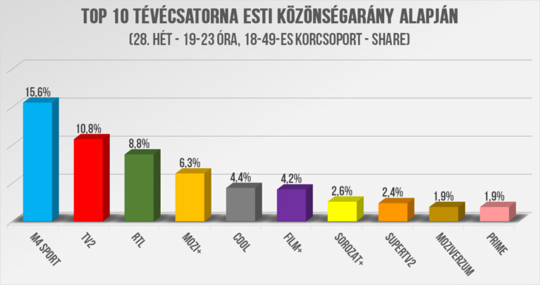 A heti összesítésben ismét az  M4 Sport lett a legnézettebb csatorna, azonban a kevesebb meccs miatt már jóval kisebb fölénnyel. A második a TV2 lett, mellyel már második hete harmadik helyre szorította az RTL-t. A negyedik most is a Mozi+, míg a Cool annyira jól teljesített, hogy az ötödik lett. A Film+ csupán a hatodik helyen végzett. A közepes kábeladók közül a legjobbak közé került a Sorozat+, a Moziverzum és a Prime. További részletek a grafikonunkban. (Minden esetben lineáris share%-ot és 18-49-es adatokat elemezzük, kivéve, ahol egyéb korosztály van jelölve.)