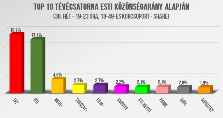 A hetet most is a TV2 nyerte az RTL előtt, ezúttal 1,6 százalékponttal. A harmadik most is a Mozi+ lett. A negyedik helyen azonban nagy meglepetésre egy közepes méretű kábelcsatorna, a Sorozat+ került, melytől századokra lemaradva a Film+ lett az ötödik. A remekelő Adom a napom utolsó hetén a VIASAT3 a hatodik helyet zsákolta be, továbbá említésre méltó még a Prime kiváló eredménye. További részletek a grafikonunkban. (Minden esetben a lineáris share%-ot és a 18-59-es adatokat elemezzük, kivéve, ahol egyéb korosztály van jelölve. A főműsoridő január óta 18-23 óra között értendő.)