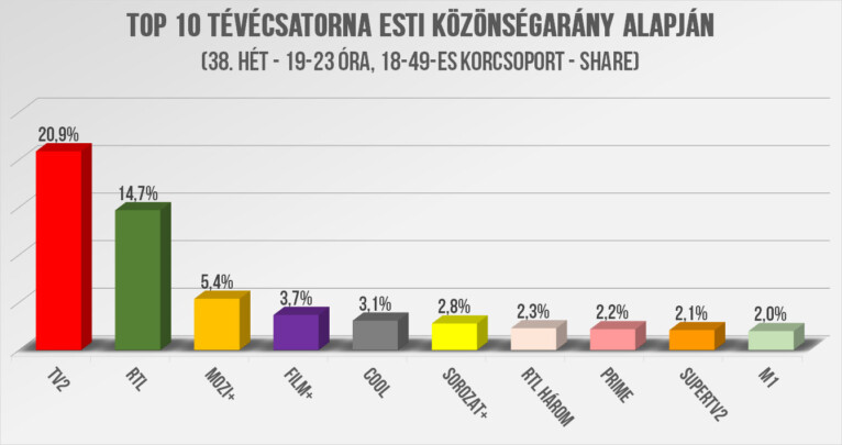 A heti összesítésben a TV2 6,2 százalékponttal előzte meg az RTL-t, így a Kalandra Fal, Fort Boyard – Az erőd általi leváltásának hetén nem hogy vissza tudott volna jönni az RTL, hanem még nőtt is a különbség a TV2 javára. A harmadik komoly fölénnyel a Mozi+ lett, a negyedik a Film+, továbbá 3 százalék felett volt még a Cool is. A közepes méretű kábelcsatornák közül a legjobbak közé került a Sorozat+, az RTL HÁROM és a Prime is. Az RTL Kettő és a VIASAT3 azonban olyan rosszul mentek, hogy most sem jutottak be a top 10-be. További részletek a grafikonunkban. (Minden esetben lineáris share%-ot és 18-49-es adatokat elemezzük, kivéve, ahol egyéb korosztály van jelölve.)