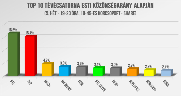 RTL: Fókusz: 533 ezer (16,3%), 18-59: 303 ezer (21,1%)