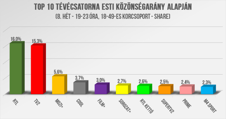 A heti összesítésben – ahogy az idei évben eddig minden esetben – az RTL nyert, ezúttal 0,7 százalékponttal a TV2 előtt. A harmadik ezúttal is a Mozi+ lett, a negyedik a Cool, míg a Film+ csak az ötödik helyen végzett. A közepes kábelcsatornák közül a legjobbak közé került a Sorozat+ és a Prime, további részletek a grafikonunkban. (Minden esetben lineáris share%-ot és 18-59-es adatokat elemezzük, kivéve, ahol egyéb korosztály van jelölve. A főműsoridő január óta 18-23 óra között értendő.)