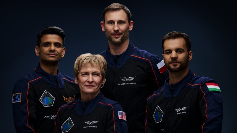 Balról jobbra: az indiai Shubhanshu Shukla, az amerikai Peggy Whitson, a lengyel Sławosz Uznański-Wiśniewski és a magyar Kapu Tibor